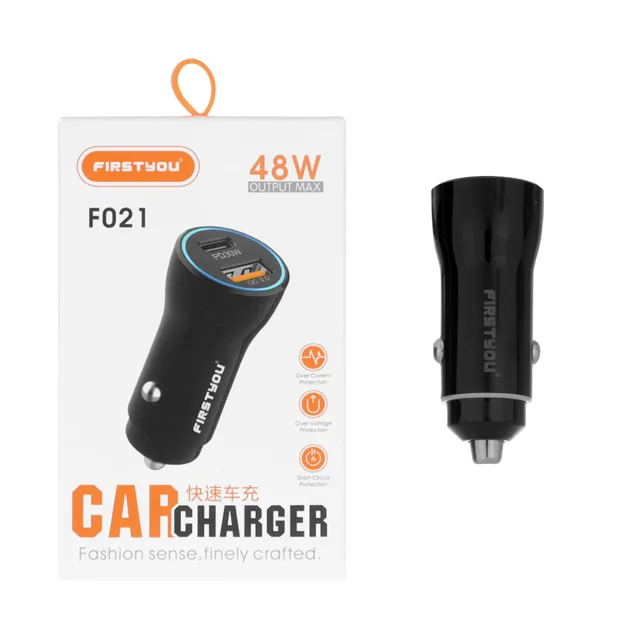 شارژر فندکی فست و PD دو پورت FIRSTYOU مدل F021 با توان 48 وات در رنگ مشکی، مناسب شارژ سریع و همزمان دو دستگاه مختلف، طراحی جمعوجور و مقاوم، ایدهآل برای استفاده در خودرو با بهرهوری بالا و ایمنی کامل در برابر نوسانات برق.